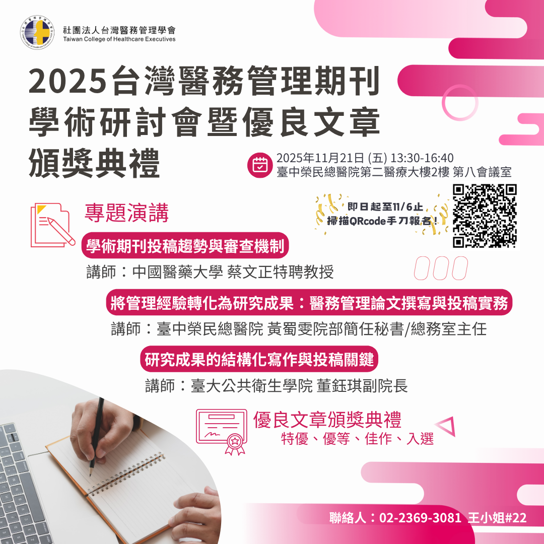 本課程旨在提升臨床與學術人員對學術期刊投稿的理解與參與度,協助同仁掌握學術品質與投稿趨勢,理解審查機制與實務應用的連結。同時,引導學員將管理與專業經驗轉化為研究成果,並學習論文結構化寫作與投稿的關鍵技巧。藉此,協助不同領域的專業人員將知識與實務發表於學術平台,進一步提升個人與機構的學術表現與影響力。
