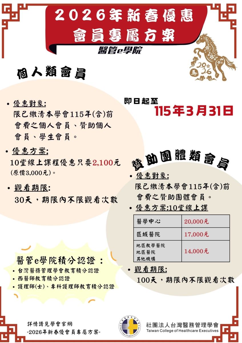醫管e學院--2026會員限定-新春專屬優惠正式上線! 【個人類會員】自選10堂課 享2,100元優惠 【贊助團體會員】自選10堂 依機構層級享14,000元~20,000元優惠(觀看期延長至100天且可認列共100名積分 )