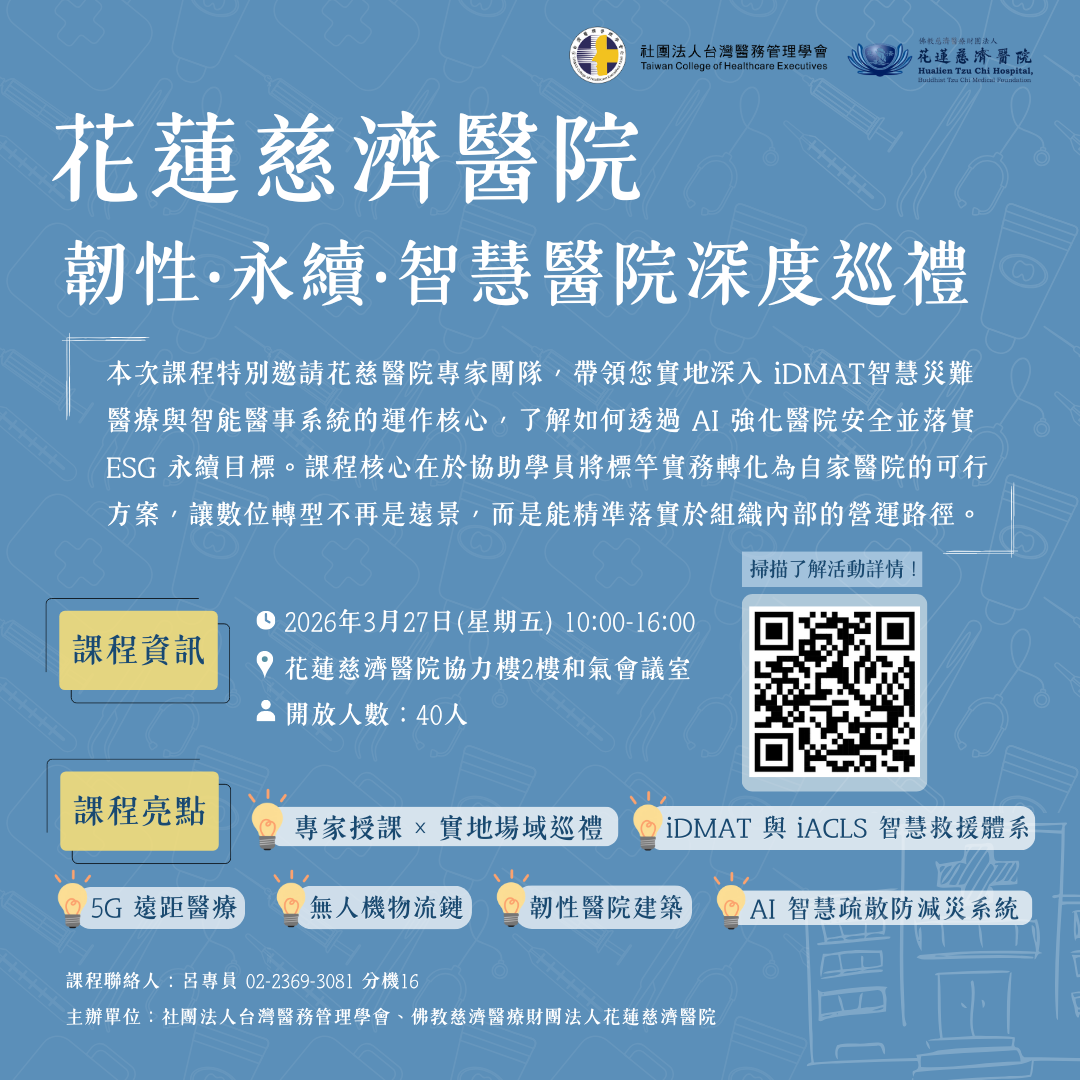 本次課程特別邀請花慈醫院專家團隊,帶領您實地深入 iDMAT智慧災難醫療與智能醫事系統的運作核心,以及如何透過 AI 強化醫院安全並落實 ESG 永續目標。課程涵蓋從急重症科技應用到 ESG 永續發展實務,透過專家授課與場域導覽,為醫療管理者提供具智慧化營運的關鍵佈局與數位化轉型的執行藍圖!